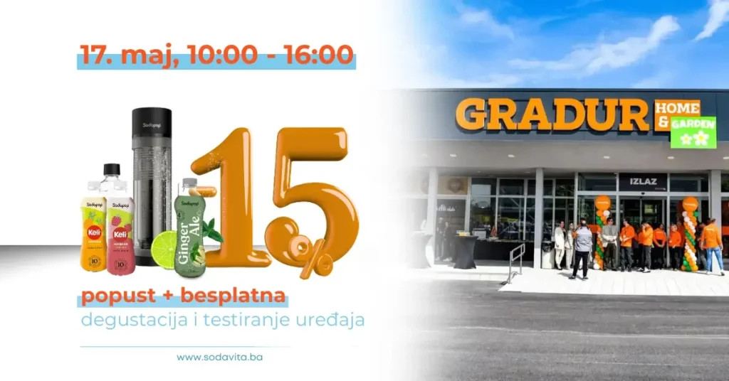 Tokom rođendanskog dana Gradura, svi Sodavita uređaji i sirupi na licu mjesta bit će dostupni uz 15% popusta. Zalihe su ograničene, pa savjetujemo da navratite ranije.